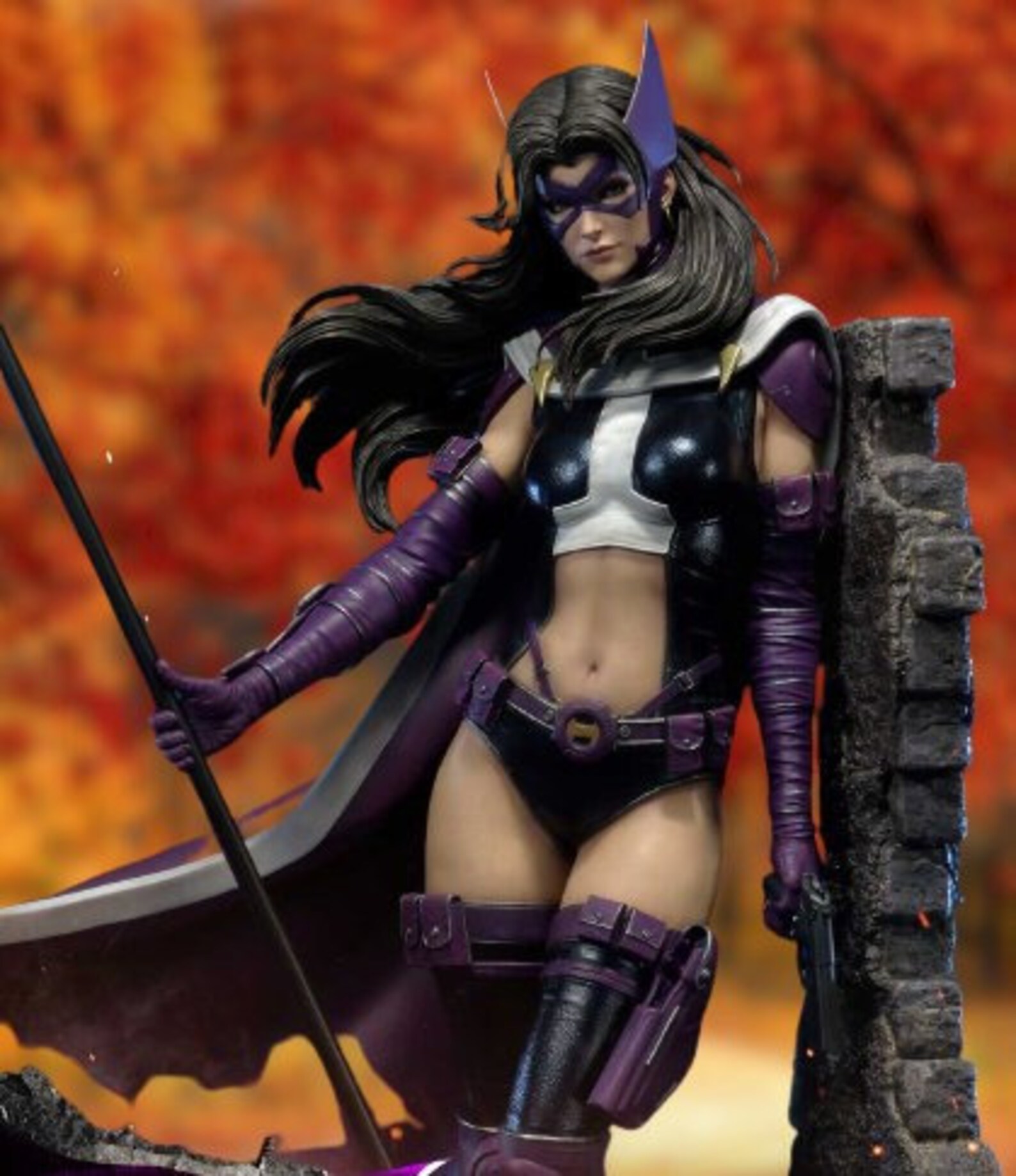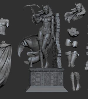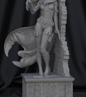 The 3D-printed Huntress model beautifully captures her fierce demeanor and iconic costume with meticulous detail. This collectible artwork showcases her unique design, making it a must-have for fans and collectors.
