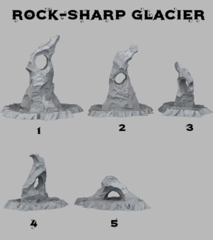 The 3D printed Sharp Glacier set showcases jagged, icy formations with striking, realistic details. Perfect for tabletop gaming and dioramas, these miniatures bring a chilling atmosphere to any scene, adding a touch of frigid beauty to your collection.